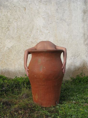 Volviendo a la pregunta ancestral, y conectándola con la idea de esa distancia después de migrar, cada objeto, música o tradición que tenemos en Venezuela la miré con ojos nuevos. Redescubriendo los rincones donde crecí. Una experiencia notable ocurrió durante mis visitas a El Cercado, mientras mis padres vivían en la Isla de Margarita. Allí existe una comunidad de alfareros, en su mayoría mujeres, que crean cerámica utilizando técnicas ancestrales: sin horno y extrayendo el material para el barro de las montañas. Inspirándome en ellas, hice una serie de performances fotográficas en las que me metí dentro de jarrones de terracota de gran escala hechos por estas alfareras y traté de hacer del cuerpo una extensión de la vasija.