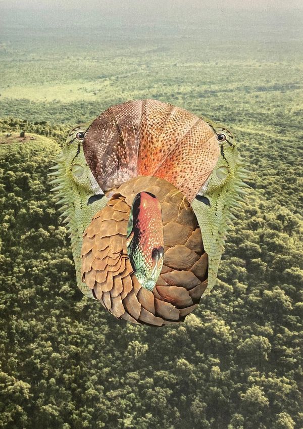 La Serie Acorazadas , una colección de collages, transmite este sentimiento de querer volver a ser uno con la naturaleza, enfatizando que la naturaleza es un refugio. Trabajé con armaduras de pangolín, el animal que se pensaba que era portador del COVID-19. Quería resaltar que la naturaleza suele ser un refugio, no una fuente de enfermedades. Los procesos zoonóticos sólo ocurren cuando los humanos interfieren con la naturaleza, mediante la deforestación y la destrucción de hábitats naturales.
