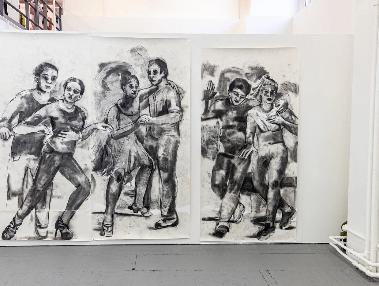 The Documentation of Time, triptych, charcoal on paper at The Slade Graduate Show, 2023. Courtesy of the artist.