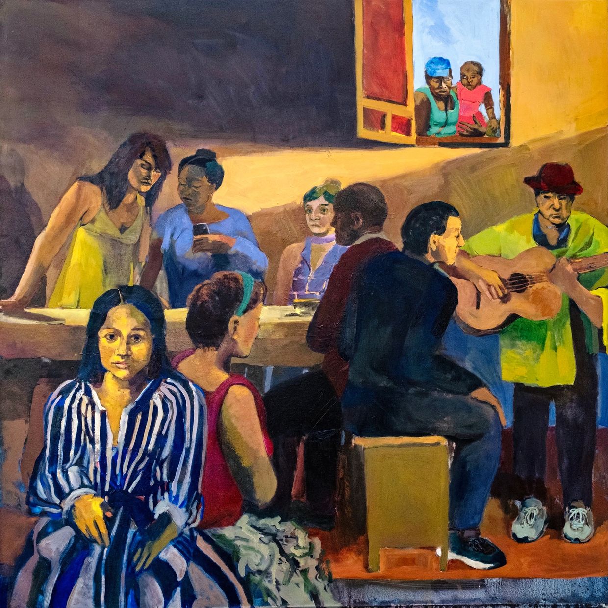 One of the components that shape Antonia Caicedo Holguin's practice is the playfulness of writing narratives with brush strokes. The characters she builds hold the same charm, depth and presence of literary protagonists in a captivating novel. Every figure or element she includes has a detailed backstory to tell. In this way, her work closely resembles that of a writer, as she constructs new narratives in a similar way as writing a book. She shapes her characters, drawing inspiration from those close to her, as well as from strangers or imagined figures. Influenced by the landscape of her home, Cali, Colombia, Antonia brings elements of her life to her paintings, using colour, memory, and imagination to connect with her intimate space. Her artworks spin around common settings and everyday actions, with a significant emphasis on human figures, all executed with remarkable skill.