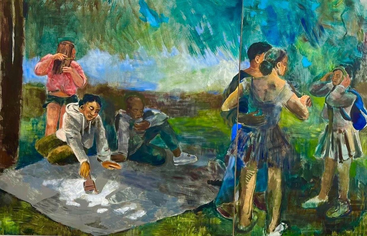 Antonia Caicedo Holguín: Anachronisms can make a painting very powerful. It can be in terms of the colour, the narrative, or it can be psychological, about people interacting and not interacting. I loved giving a title to that painting, “The Disappearance of the Sun''. I chose it because in Cali, where I am from, there is a moment during sunset when everything feels like it becomes blue. Especially if you're near the countryside, the blue with the trees and the mountains does something so powerful and beautiful, and I really wanted to capture that. It also has to do with my feeling of London’s contemporary life. I believe London is such a fun place, but at the same time, when taking the tube, for example, there are so many people around you and yet such a deep disconnection among everyone. Of course, this also happens in Latin America, but you don't feel it the same way. For instance, if you take a bus in the capital, you may not talk to everyone, but people will be very polite and notice you there. The experience is very different. So, in the painting, there is an aspect of this commentary on how contemporary life in London has shocked me. “The Disappearance of the Sun'' is almost like a dream because it's set back home. The characters are a bit like a dream, too. Some of them represent people I miss from back home, and some of them are friends I met here. But there's something in the atmosphere of that artwork that is disjointed.