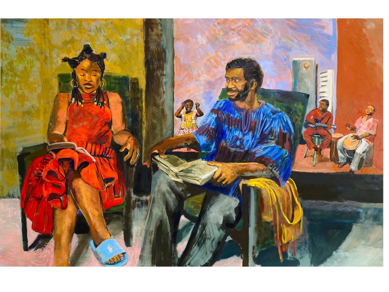 I am currently working on a piece where I am painting a cameo appearance and is referencing Frieze Magazine’s 2018 edition which has Beatriz González on the cover. I remember seeing it online and thought, “Oh my God, it's the first time I've seen a Frieze cover with a Colombian painter on it”. So, I started that painting with the idea of making references to books and emphasising the significance of certain kinds of publications or artists. That's what I'm delving into. I am also painting my social circle in London, my life here, and especially touching upon people and spaces in London that are close to my heart. Salsa dancing in London will continue to be part of my paintings, as well.